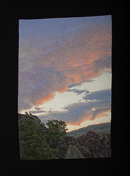 | Early Morning Foothills, 2024 Embroidery 19.5"h x 13.25"w, framed 27.5"h x 21.25"w, Available: Duane Reed Gallery |