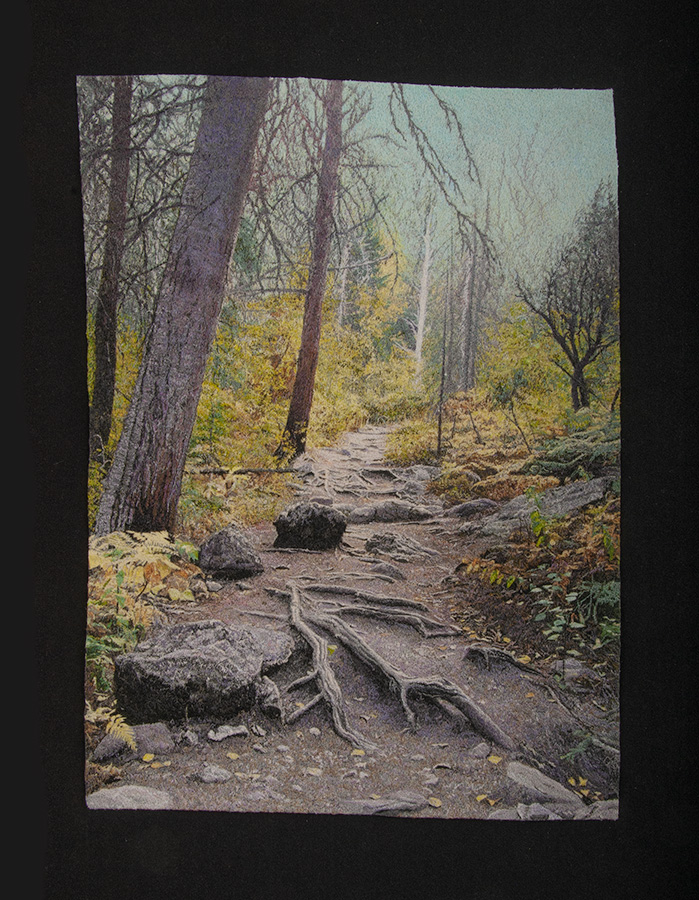 Forest Steps, 2020 Embroidery 20.75"h x 15"w, framed 27.25"h x 22.75"w. Sold: Duane Reed Gallery |